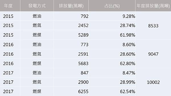 台灣三年來的空汙排碳的增量,最大肇因來自燃煤發電(作者整理)